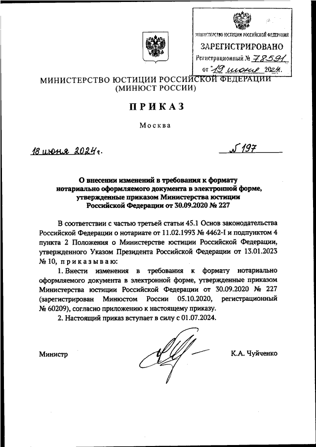 ПРИКАЗ Минюста РФ от 18.06.2024 N 197
