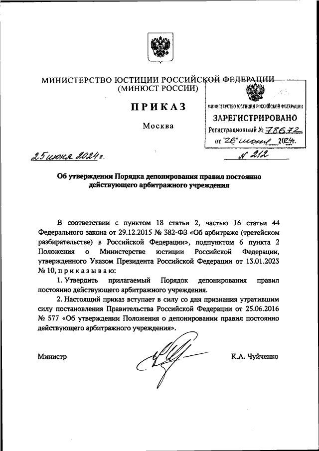 ПРИКАЗ Минюста РФ от 25.06.2024 N 212
