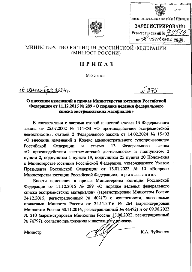 ПРИКАЗ Минюста РФ от 16.09.2024 N 275