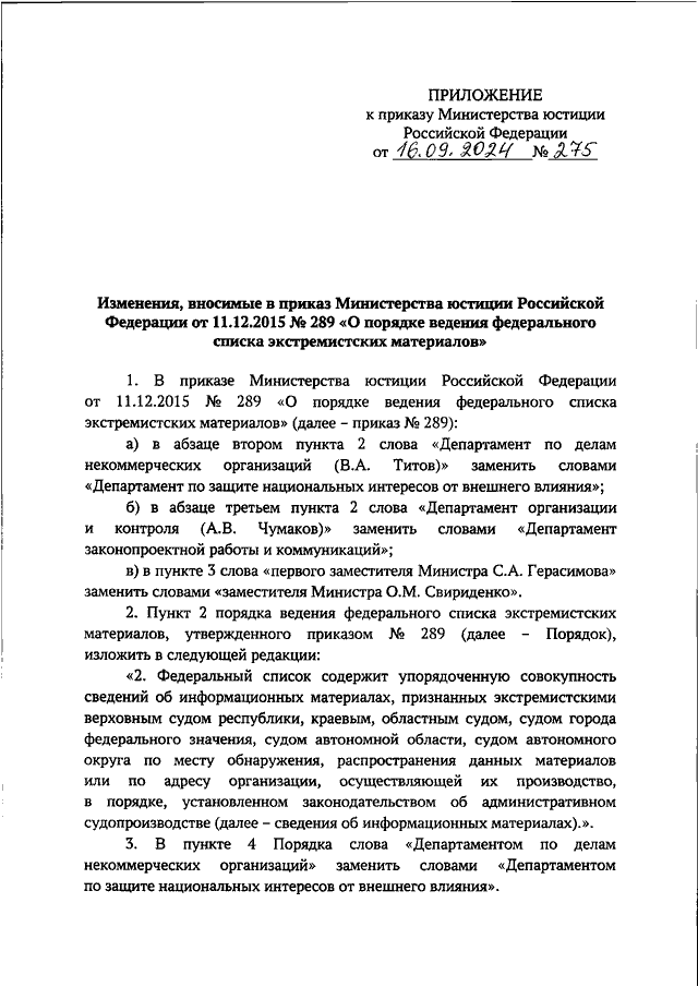 ПРИКАЗ Минюста РФ от 16.09.2024 N 275