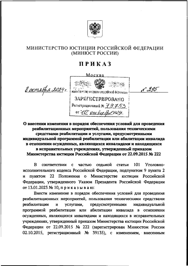 ПРИКАЗ Минюста РФ от 08.10.2024 N 295