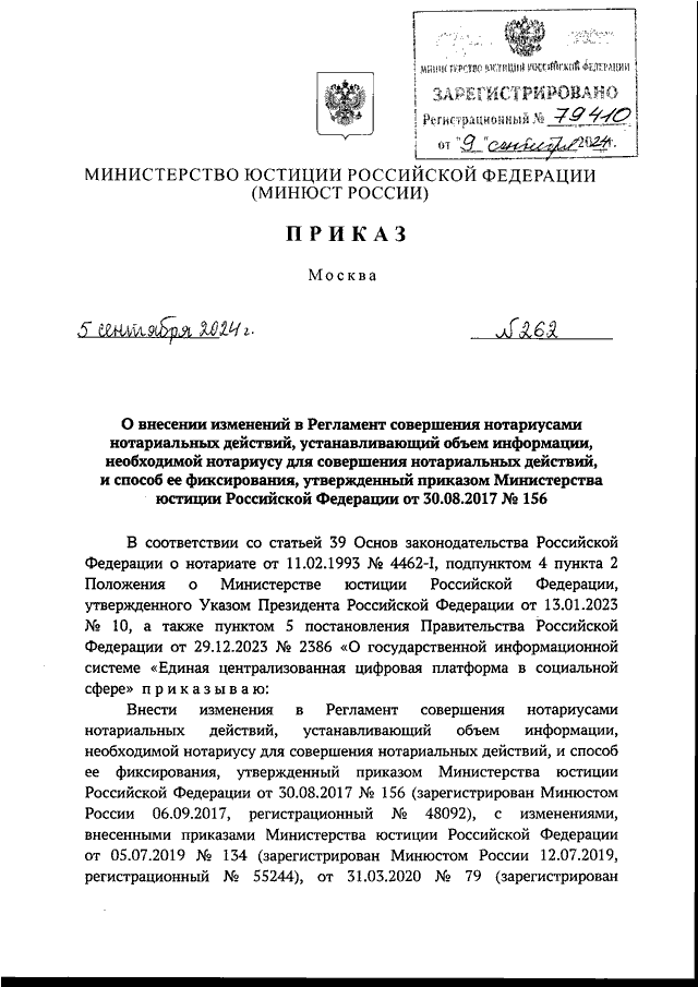 ПРИКАЗ Минюста РФ от 05.09.2024 N 262
