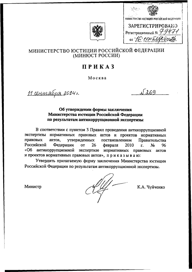 ПРИКАЗ Минюста РФ от 11.09.2024 N 269