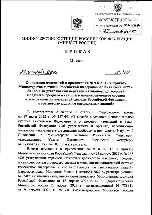 ПРИКАЗ Минюста РФ от 21.10.2024 N 310