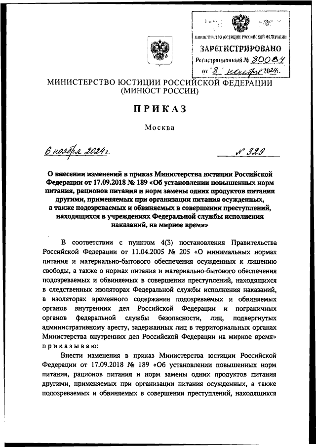 ПРИКАЗ Минюста РФ от 06.11.2024 N 329