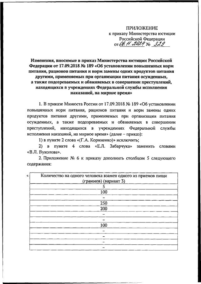 "О ВНЕСЕНИИ ИЗМЕНЕНИЙ В ПРИКАЗ МИНИСТЕРСТВА ЮСТИЦИИ РОССИЙСКОЙ ФЕДЕРАЦИИ ОТ 17.09.2018 N 189 "ОБ УСТАНОВЛЕНИИ ПОВЫШЕННЫХ НОРМ ПИТАНИЯ, РАЦИОНОВ ПИТАНИЯ И НОРМ ЗАМЕНЫ ОДНИХ ПРОДУКТОВ ПИТАНИЯ ДРУГИМИ, ПРИМЕНЯЕМЫХ ПРИ ОРГАНИЗАЦИИ ПИТАНИЯ ОСУЖДЕННЫХ, А ТАКЖЕ ПОДОЗРЕВАЕМЫХ И ОБВИНЯЕМЫХ В СОВЕРШЕНИИ ПРЕСТУПЛЕНИЙ, НАХОДЯЩИХСЯ В УЧРЕЖДЕНИЯХ ФЕДЕРАЛЬНОЙ СЛУЖБЫ ИСПОЛНЕНИЯ НАКАЗАНИЙ, НА МИРНОЕ ВРЕМЯ"