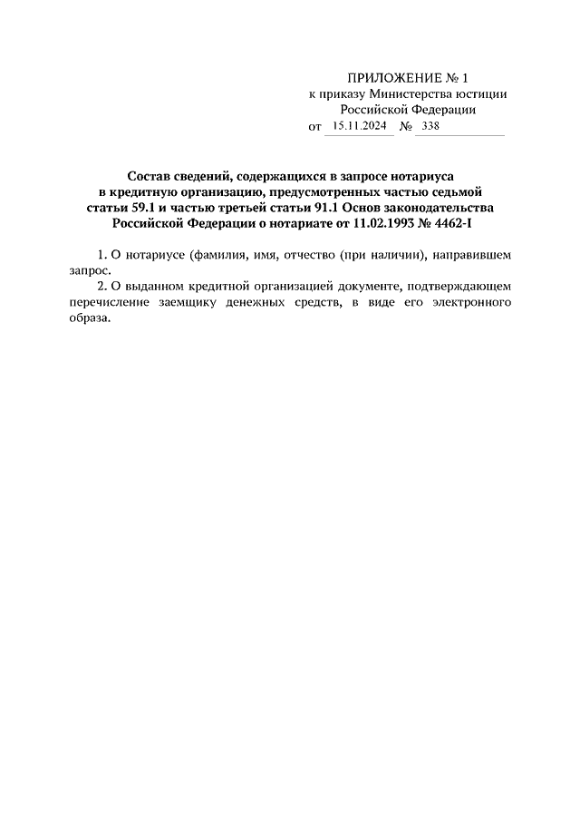 "ОБ УТВЕРЖДЕНИИ СОСТАВА СВЕДЕНИЙ, СОДЕРЖАЩИХСЯ В ЗАПРОСЕ НОТАРИУСА В КРЕДИТНУЮ ОРГАНИЗАЦИЮ, И ФОРМЫ ОТВЕТА КРЕДИТНОЙ ОРГАНИЗАЦИИ НА ЗАПРОС НОТАРИУСА, ПРЕДУСМОТРЕННЫХ ЧАСТЬЮ СЕДЬМОЙ СТАТЬИ 59.1 И ЧАСТЬЮ ТРЕТЬЕЙ СТАТЬИ 91.1 ОСНОВ ЗАКОНОДАТЕЛЬСТВА РОССИЙСКОЙ ФЕДЕРАЦИИ О НОТАРИАТЕ ОТ 11.02.1993 N 4462-I"