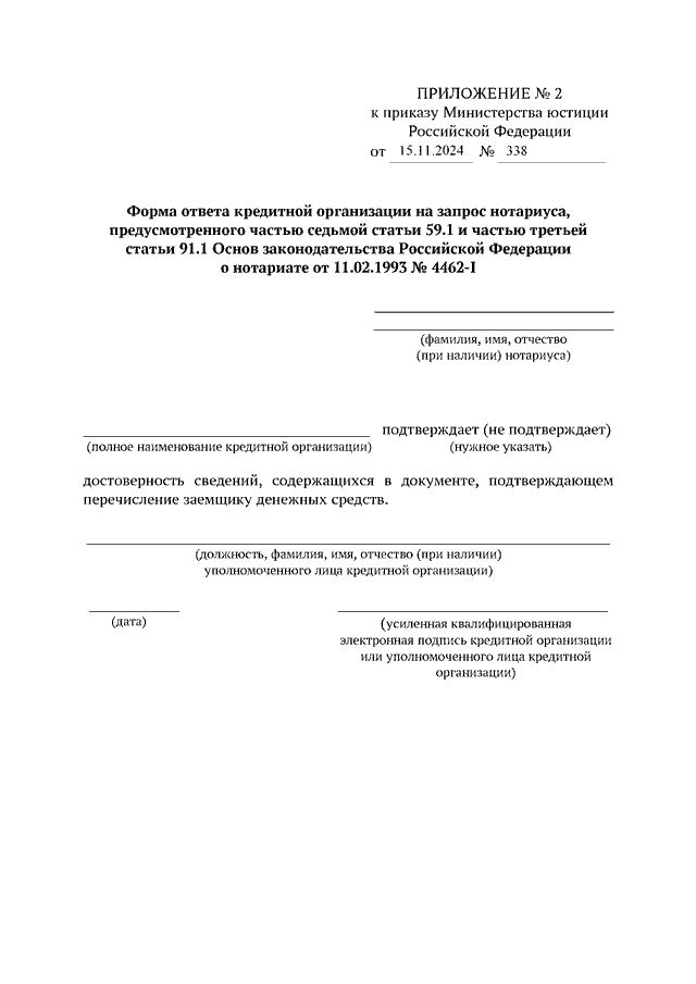"ОБ УТВЕРЖДЕНИИ СОСТАВА СВЕДЕНИЙ, СОДЕРЖАЩИХСЯ В ЗАПРОСЕ НОТАРИУСА В КРЕДИТНУЮ ОРГАНИЗАЦИЮ, И ФОРМЫ ОТВЕТА КРЕДИТНОЙ ОРГАНИЗАЦИИ НА ЗАПРОС НОТАРИУСА, ПРЕДУСМОТРЕННЫХ ЧАСТЬЮ СЕДЬМОЙ СТАТЬИ 59.1 И ЧАСТЬЮ ТРЕТЬЕЙ СТАТЬИ 91.1 ОСНОВ ЗАКОНОДАТЕЛЬСТВА РОССИЙСКОЙ ФЕДЕРАЦИИ О НОТАРИАТЕ ОТ 11.02.1993 N 4462-I"