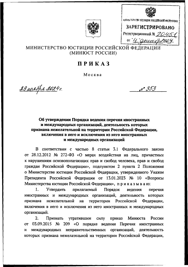 ПРИКАЗ Минюста РФ от 29.11.2024 N 353