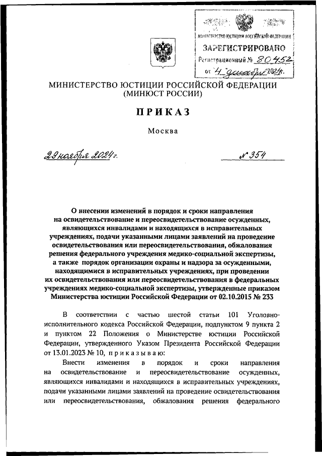 ПРИКАЗ Минюста РФ от 29.11.2024 N 354