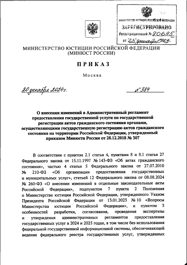 ПРИКАЗ Минюста РФ от 20.12.2024 N 384
