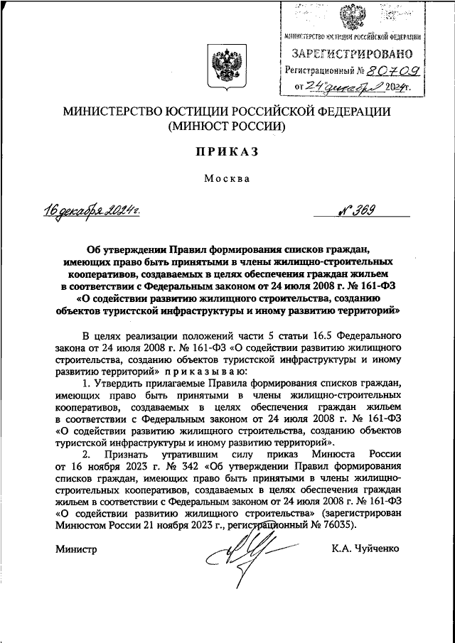 ПРИКАЗ Минюста РФ от 16.12.2024 N 369