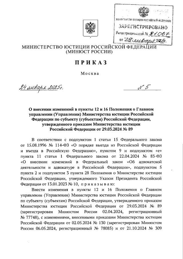 ПРИКАЗ Минюста РФ от 24.01.2025 N 5
