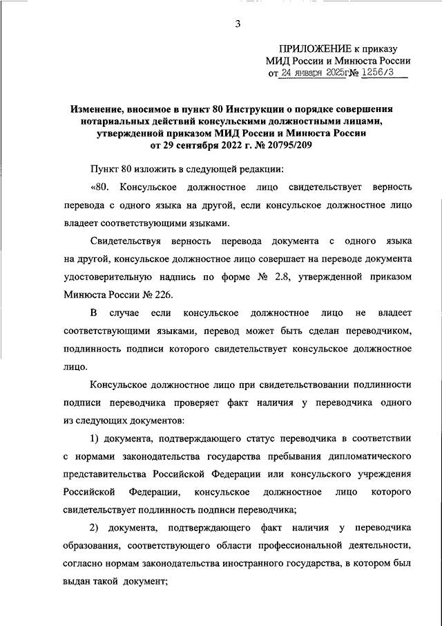 "О ВНЕСЕНИИ ИЗМЕНЕНИЯ В ПУНКТ 80 ИНСТРУКЦИИ О ПОРЯДКЕ СОВЕРШЕНИЯ НОТАРИАЛЬНЫХ ДЕЙСТВИЙ КОНСУЛЬСКИМИ ДОЛЖНОСТНЫМИ ЛИЦАМИ, УТВЕРЖДЕННОЙ ПРИКАЗОМ МИД РОССИИ И МИНЮСТА РОССИИ ОТ 29 СЕНТЯБРЯ 2022 Г. N 20795/209"