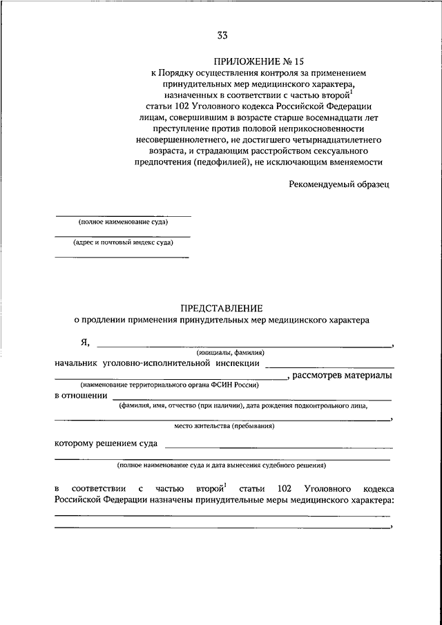 "ОБ УТВЕРЖДЕНИИ ПОРЯДКА ОСУЩЕСТВЛЕНИЯ КОНТРОЛЯ ЗА ПРИМЕНЕНИЕМ ПРИНУДИТЕЛЬНЫХ МЕР МЕДИЦИНСКОГО ХАРАКТЕРА, НАЗНАЧЕННЫХ В СООТВЕТСТВИИ С ЧАСТЬЮ ВТОРОЙ.1 СТАТЬИ 102 УГОЛОВНОГО КОДЕКСА РОССИЙСКОЙ ФЕДЕРАЦИИ ЛИЦАМ, СОВЕРШИВШИМ В ВОЗРАСТЕ СТАРШЕ ВОСЕМНАДЦАТИ ЛЕТ ПРЕСТУПЛЕНИЕ ПРОТИВ ПОЛОВОЙ НЕПРИКОСНОВЕННОСТИ НЕСОВЕРШЕННОЛЕТНЕГО, НЕ ДОСТИГШЕГО ЧЕТЫРНАДЦАТИЛЕТНЕГО ВОЗРАСТА, И СТРАДАЮЩИМ РАССТРОЙСТВОМ СЕКСУАЛЬНОГО ПРЕДПОЧТЕНИЯ (ПЕДОФИЛИЕЙ), НЕ ИСКЛЮЧАЮЩИМ ВМЕНЯЕМОСТИ"