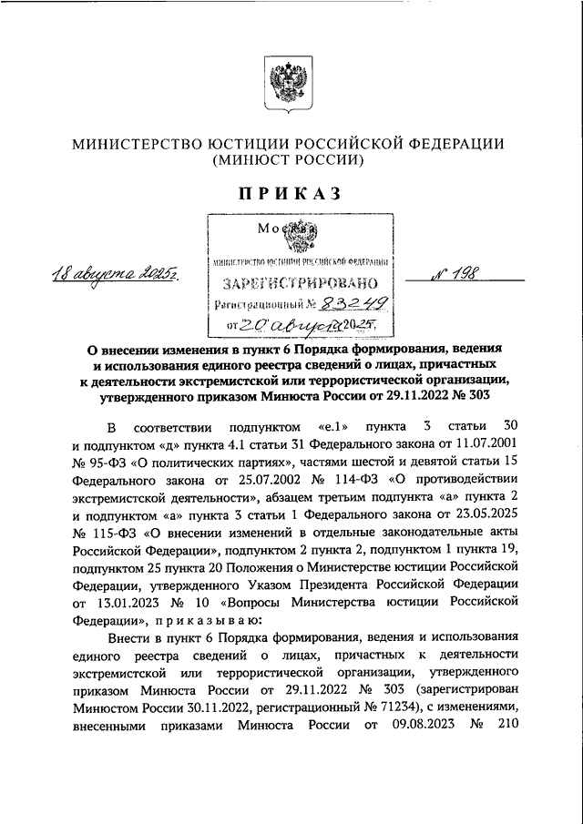 ПРИКАЗ Минюста РФ от 18.08.2025 N 198