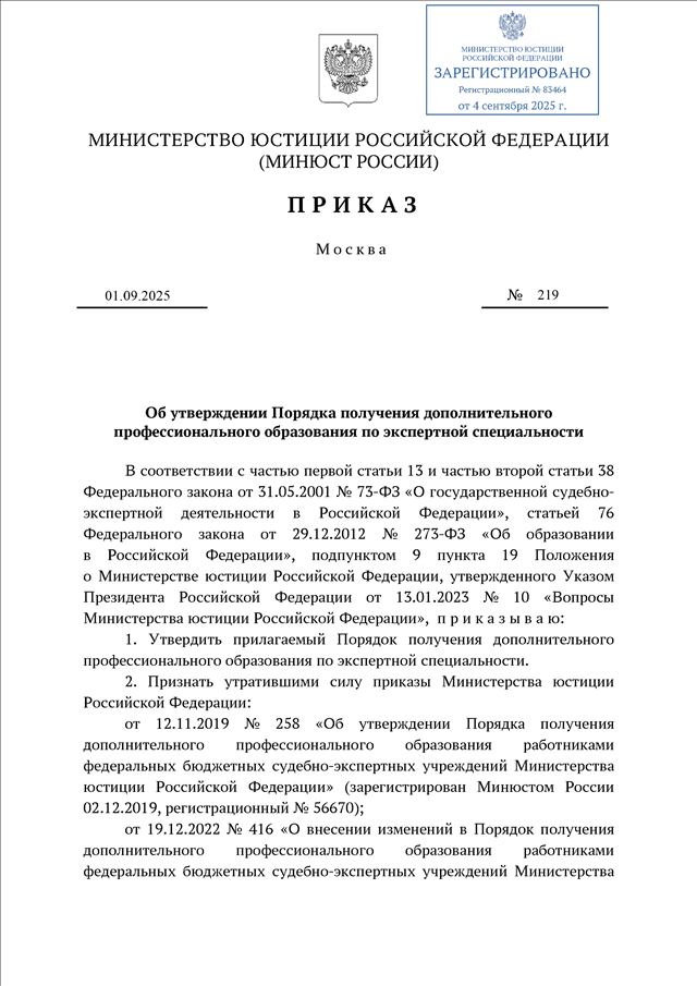 ПРИКАЗ Минюста РФ от 01.09.2025 N 219