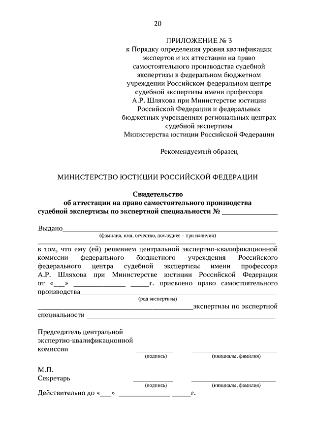 "ОБ УТВЕРЖДЕНИИ ПОРЯДКА ОПРЕДЕЛЕНИЯ УРОВНЯ КВАЛИФИКАЦИИ ЭКСПЕРТОВ И ИХ АТТЕСТАЦИИ НА ПРАВО САМОСТОЯТЕЛЬНОГО ПРОИЗВОДСТВА СУДЕБНОЙ ЭКСПЕРТИЗЫ В ФЕДЕРАЛЬНОМ БЮДЖЕТНОМ УЧРЕЖДЕНИИ РОССИЙСКОМ ФЕДЕРАЛЬНОМ ЦЕНТРЕ СУДЕБНОЙ ЭКСПЕРТИЗЫ ИМЕНИ ПРОФЕССОРА А.Р. ШЛЯХОВА ПРИ МИНИСТЕРСТВЕ ЮСТИЦИИ РОССИЙСКОЙ ФЕДЕРАЦИИ И ФЕДЕРАЛЬНЫХ БЮДЖЕТНЫХ УЧРЕЖДЕНИЯХ РЕГИОНАЛЬНЫХ ЦЕНТРАХ СУДЕБНОЙ ЭКСПЕРТИЗЫ МИНИСТЕРСТВА ЮСТИЦИИ РОССИЙСКОЙ ФЕДЕРАЦИИ"