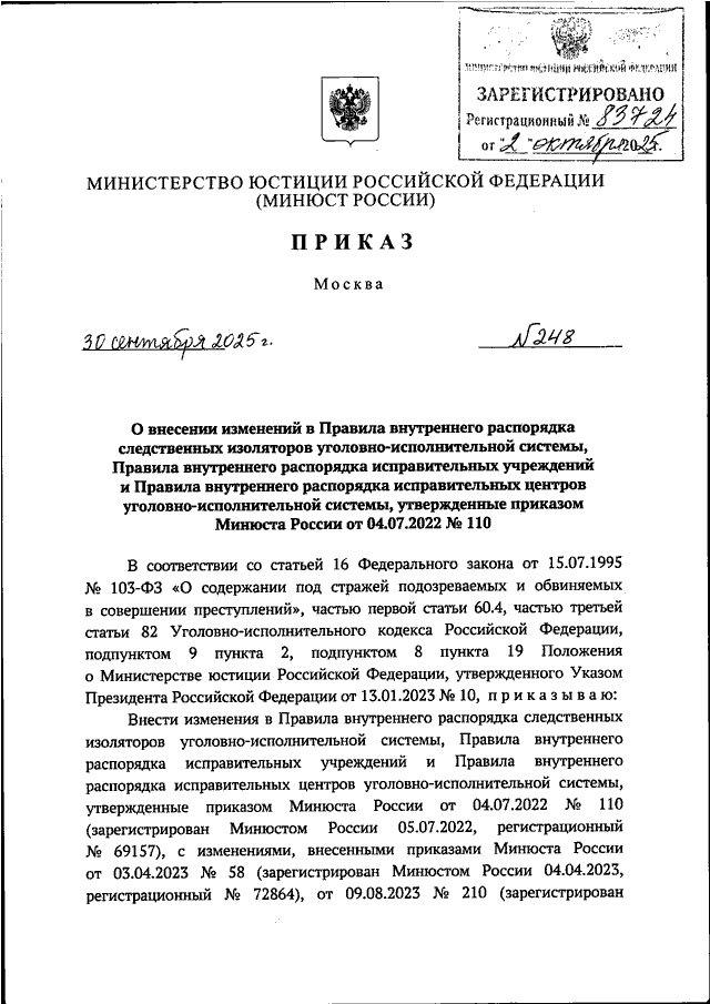 ПРИКАЗ Минюста РФ от 30.09.2025 N 248