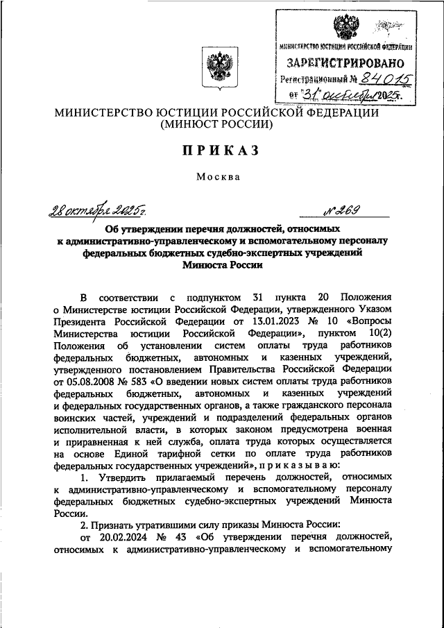 ПРИКАЗ Минюста РФ от 28.10.2025 N 269