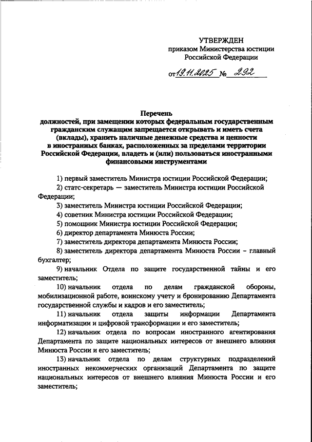 ПРИКАЗ Минюста РФ от 19.11.2025 N 292