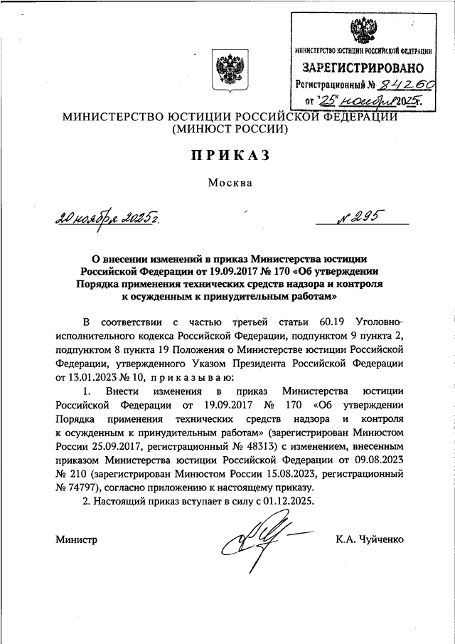 ПРИКАЗ Минюста РФ от 20.11.2025 N 295