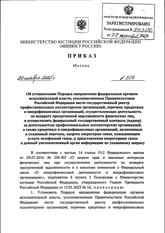 ПРИКАЗ Минюста РФ от 26.11.2025 N 307