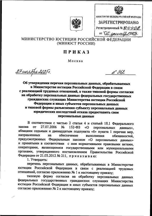 ПРИКАЗ Минюста РФ от 27.11.2025 N 312