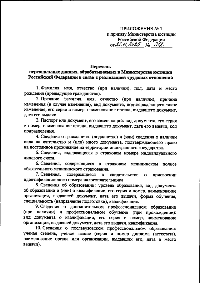 ПРИКАЗ Минюста РФ от 27.11.2025 N 312