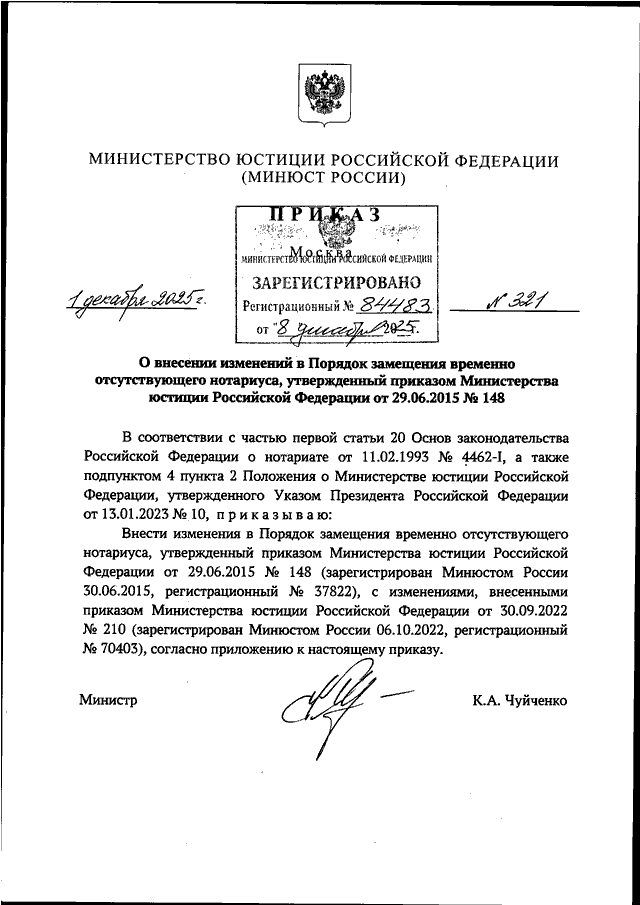 ПРИКАЗ Минюста РФ от 01.12.2025 N 321