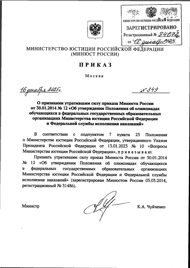 ПРИКАЗ Минюста РФ от 16.12.2025 N 349