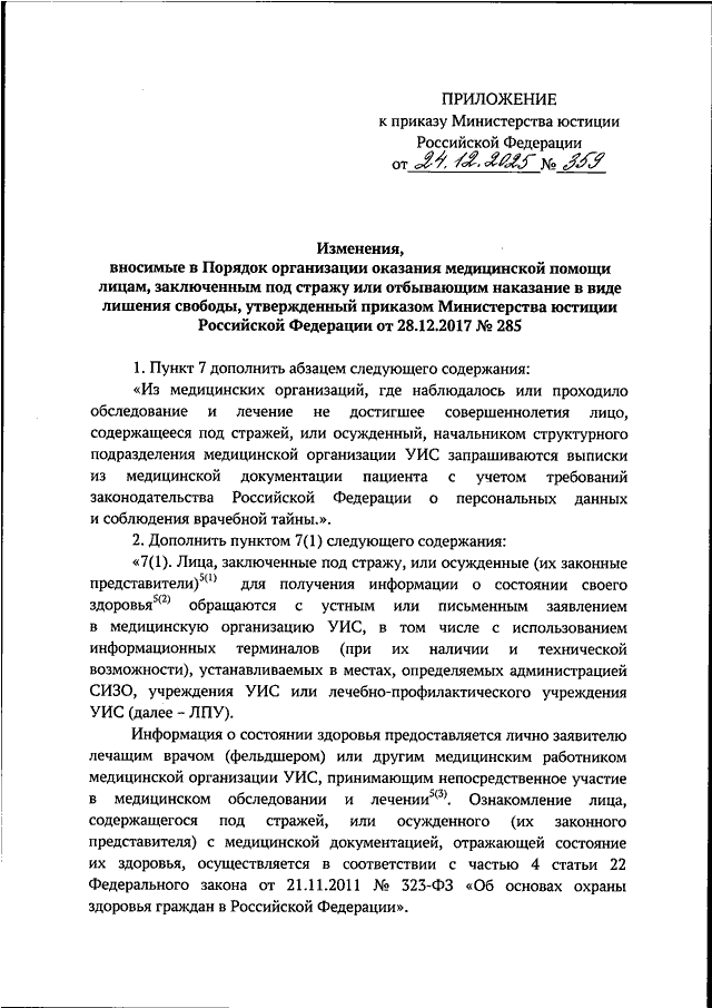 "О ВНЕСЕНИИ ИЗМЕНЕНИЙ В ПОРЯДОК ОРГАНИЗАЦИИ ОКАЗАНИЯ МЕДИЦИНСКОЙ ПОМОЩИ ЛИЦАМ, ЗАКЛЮЧЕННЫМ ПОД СТРАЖУ ИЛИ ОТБЫВАЮЩИМ НАКАЗАНИЕ В ВИДЕ ЛИШЕНИЯ СВОБОДЫ, УТВЕРЖДЕННЫЙ ПРИКАЗОМ МИНИСТЕРСТВА ЮСТИЦИИ РОССИЙСКОЙ ФЕДЕРАЦИИ ОТ 28.12.2017 N 285"