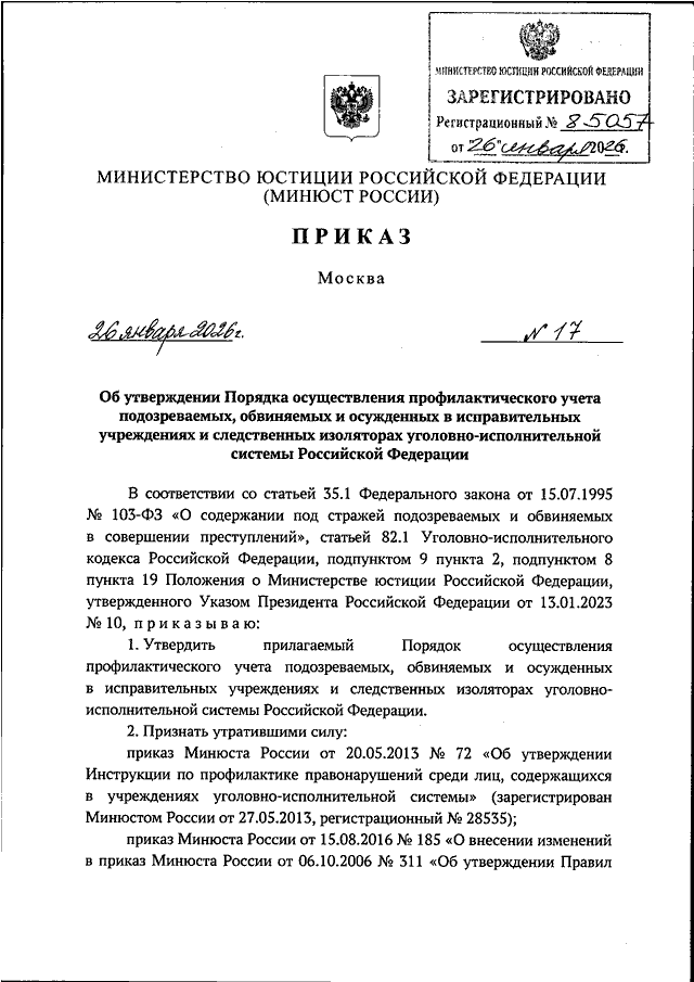 ПРИКАЗ Минюста РФ от 26.01.2026 N 17