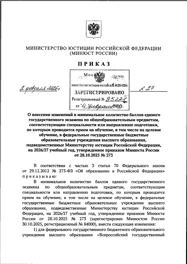 ПРИКАЗ Минюста РФ от 02.02.2026 N 27