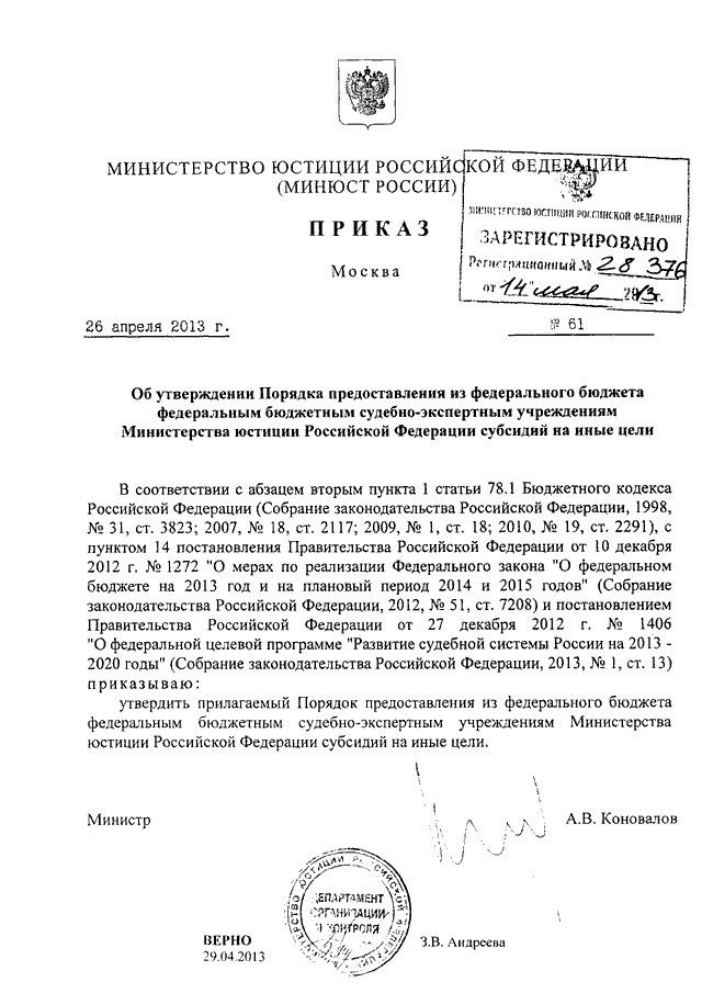 ПРИКАЗ Минюста РФ от 26.04.2013 N 61