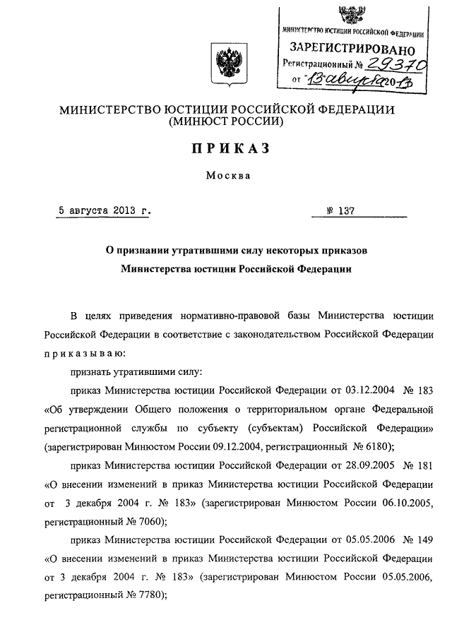 ПРИКАЗ Минюста РФ от 05.08.2013 N 137
