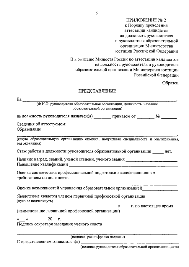 "ОБ УТВЕРЖДЕНИИ ПОРЯДКА ПРОВЕДЕНИЯ АТТЕСТАЦИИ КАНДИДАТОВ НА ДОЛЖНОСТЬ РУКОВОДИТЕЛЯ И РУКОВОДИТЕЛЯ ОБРАЗОВАТЕЛЬНОЙ ОРГАНИЗАЦИИ МИНИСТЕРСТВА ЮСТИЦИИ РОССИЙСКОЙ ФЕДЕРАЦИИ"