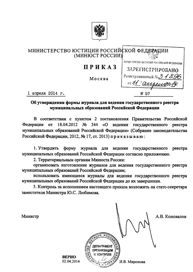 ПРИКАЗ Минюста РФ от 01.04.2014 N 57
