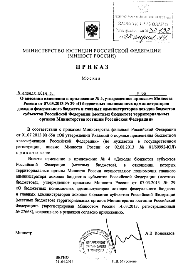 ПРИКАЗ Минюста РФ от 08.04.2014 N 66