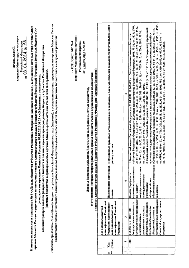 "О ВНЕСЕНИИ ИЗМЕНЕНИЯ В ПРИЛОЖЕНИЕ N 4, УТВЕРЖДЕННОЕ ПРИКАЗОМ МИНЮСТА РОССИИ ОТ 07.03.2013 N 29 "О БЮДЖЕТНЫХ ПОЛНОМОЧИЯХ АДМИНИСТРАТОРОВ ДОХОДОВ ФЕДЕРАЛЬНОГО БЮДЖЕТА И ГЛАВНЫХ АДМИНИСТРАТОРОВ ДОХОДОВ БЮДЖЕТОВ СУБЪЕКТОВ РОССИЙСКОЙ ФЕДЕРАЦИИ (МЕСТНЫХ БЮДЖЕТОВ) ТЕРРИТОРИАЛЬНЫХ ОРГАНОВ МИНИСТЕРСТВА ЮСТИЦИИ РОССИЙСКОЙ ФЕДЕРАЦИИ"