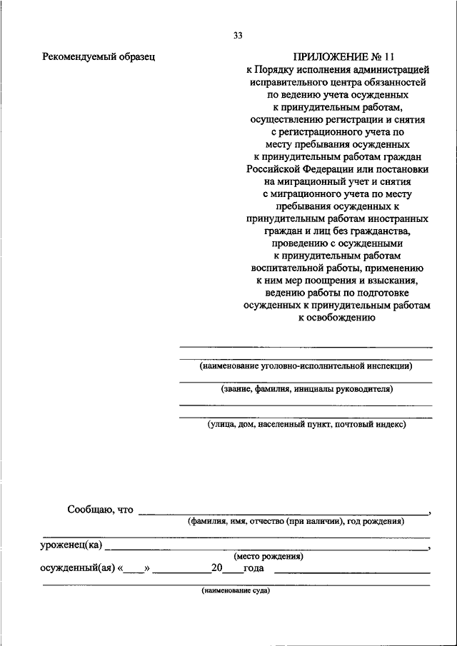 "ОБ УТВЕРЖДЕНИИ ПОРЯДКА ИСПОЛНЕНИЯ АДМИНИСТРАЦИЕЙ ИСПРАВИТЕЛЬНОГО ЦЕНТРА ОБЯЗАННОСТЕЙ ПО ВЕДЕНИЮ УЧЕТА ОСУЖДЕННЫХ К ПРИНУДИТЕЛЬНЫМ РАБОТАМ, ОСУЩЕСТВЛЕНИЮ РЕГИСТРАЦИИ И СНЯТИЯ С РЕГИСТРАЦИОННОГО УЧЕТА ПО МЕСТУ ПРЕБЫВАНИЯ ОСУЖДЕННЫХ К ПРИНУДИТЕЛЬНЫМ РАБОТАМ ГРАЖДАН РОССИЙСКОЙ ФЕДЕРАЦИИ ИЛИ ПОСТАНОВКИ НА МИГРАЦИОННЫЙ УЧЕТ И СНЯТИЯ С МИГРАЦИОННОГО УЧЕТА ПО МЕСТУ ПРЕБЫВАНИЯ ОСУЖДЕННЫХ К ПРИНУДИТЕЛЬНЫМ РАБОТАМ ИНОСТРАННЫХ ГРАЖДАН И ЛИЦ БЕЗ ГРАЖДАНСТВА, ПРОВЕДЕНИЮ С ОСУЖДЕННЫМИ К ПРИНУДИТЕЛЬНЫМ РАБОТАМ ВОСПИТАТЕЛЬНОЙ РАБОТЫ, ПРИМЕНЕНИЮ К НИМ МЕР ПООЩРЕНИЯ И ВЗЫСКАНИЯ, ВЕДЕНИЮ РАБОТЫ ПО ПОДГОТОВКЕ ОСУЖДЕННЫХ К ПРИНУДИТЕЛЬНЫМ РАБОТАМ К ОСВОБОЖДЕНИЮ"