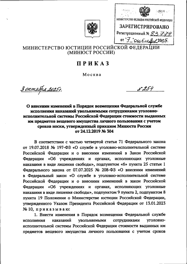 ПРИКАЗ Минюста РФ от 03.10.2025 N 254